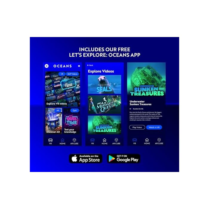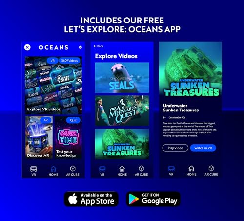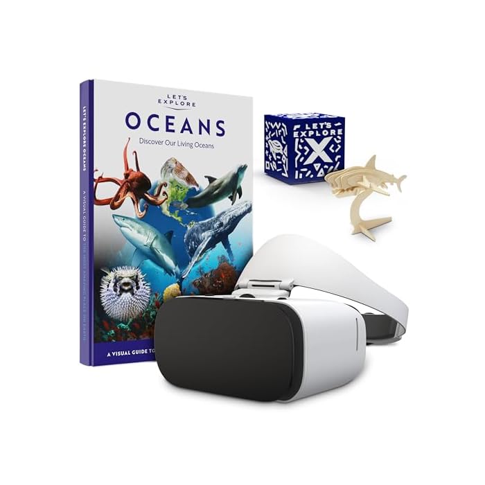 EXPLORE, DISCOVER & LEARN WITH LET’S EXPLORE OCEANS: Fully Immersive, 360 Degree, Virtual Reality, Educational Experience VR glasses. For Kids and Adults of all ages. Everything you need to explore the oceans without leaving your room. Pack includes a VR headset for the phone and a Magical Holographic Cube; watch it come to life in your hands with amazing Augmented Reality. The pack includes a color fact book, Sticker Book, Giant Poster, and Shark Model.