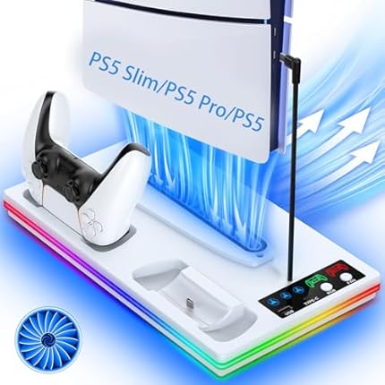 PS5 / PS5 Slim Stand and Cooling Station with LED Controller Charging Station for PlayStation 5 Slim/PS5 Console, PS5 Console Disc/Digital Edition, PS5 / PS5 Slim Accessories with 3 Level Cooling Fan